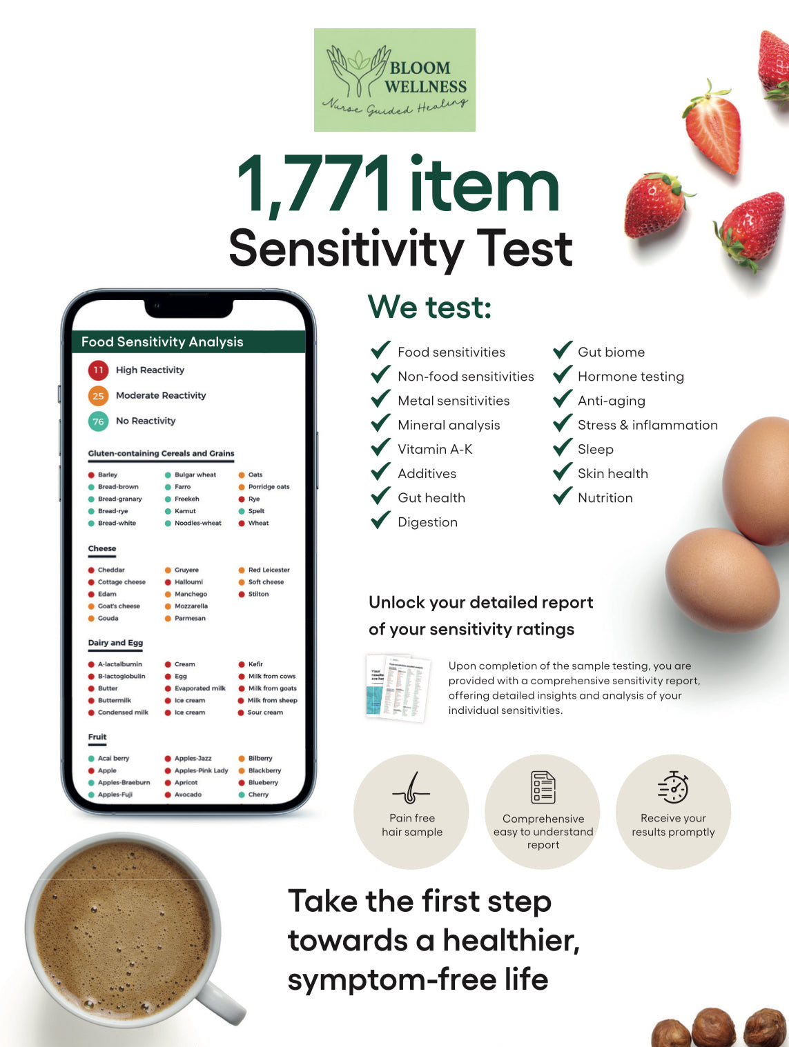 This non-invasive hair sensitivity analysis is a wellness-focused, educational tool designed to explore potential patterns of reactivity in the body. It supports informed nutrition, lifestyle, and wellness planning and is not intended to diagnose medical conditions or identify food allergies.