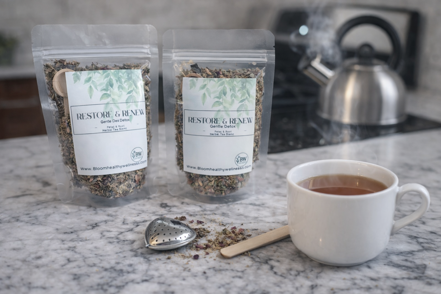 Restore & Renew is a grounding detox-support blend crafted for moments when your system needs a reset — not an everyday tea. Dandelion and burdock roots gently support liver and digestive pathways, helping the body process and release what it no longer needs. Red clover and calendula encourage lymphatic flow, while ginger and orange peel offer warmth and digestive comfort. Rose petals bring emotional ease and skin-nourishing energetics.